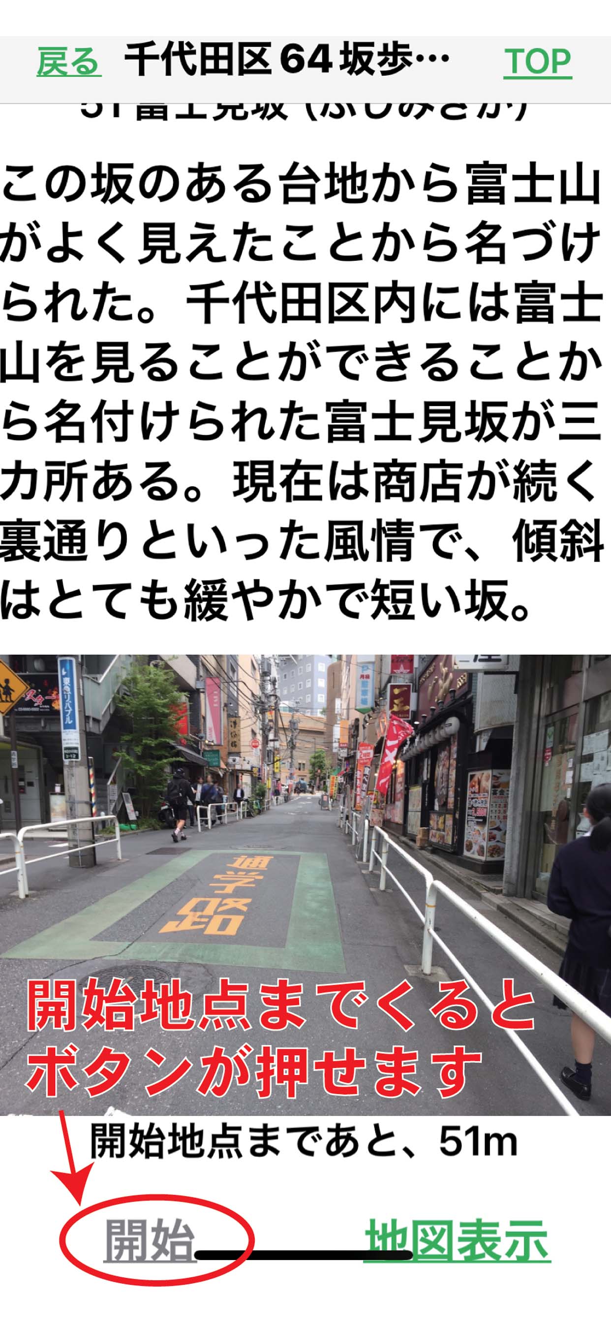 A坂名ボタンを押すと、坂名の由来と写真を表示