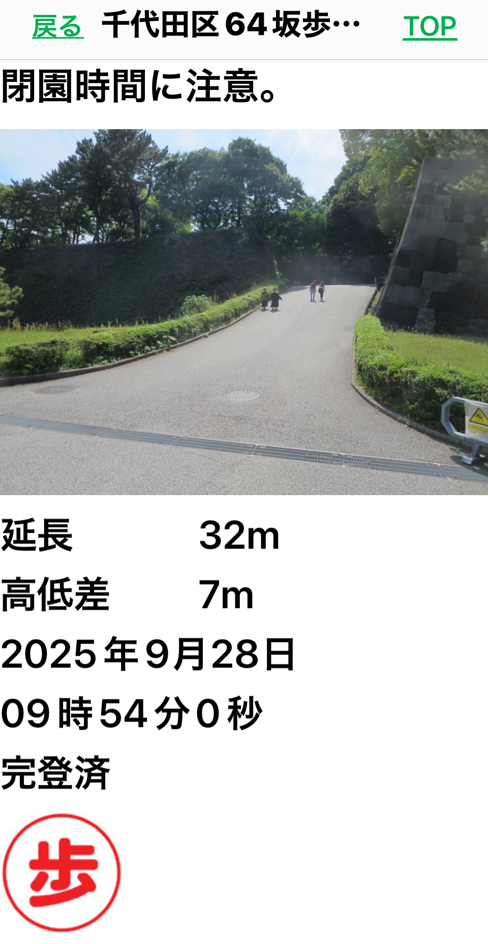 D登った坂の延長、高低差、日時を確認します。