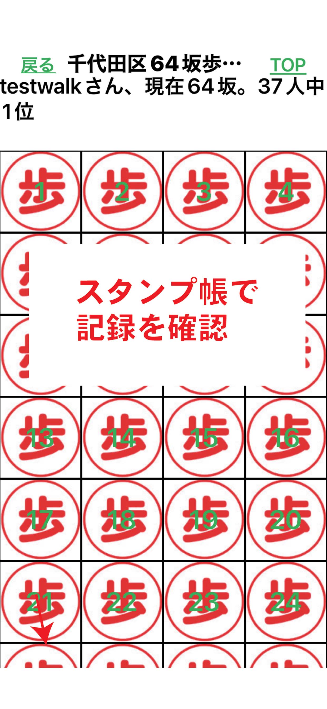 Eスタンプ帳には、これまで歩いた坂のスタンプが一覧表示されます。ランキングも出ます。